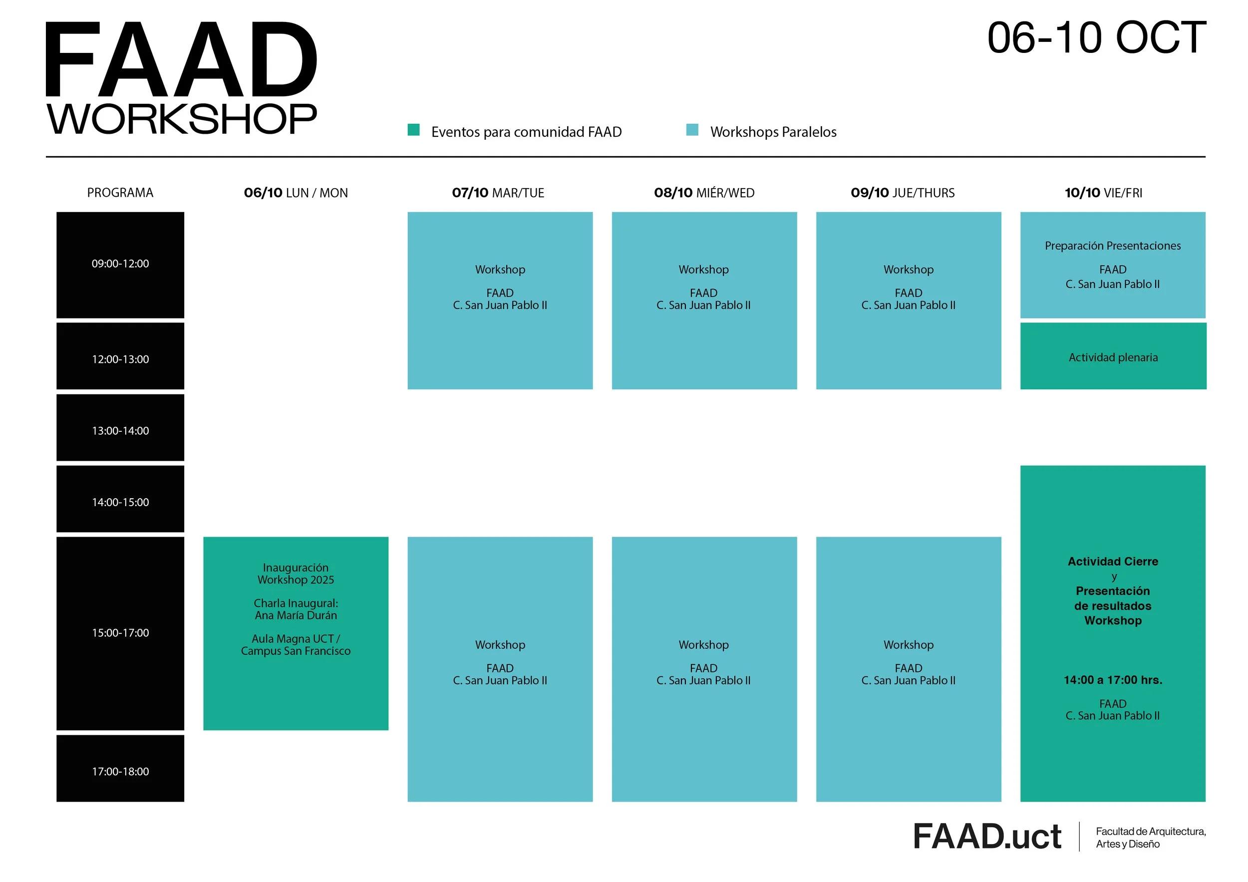 El Workshop FAAD es un evento anual cuidadosamente diseñado como parte integral del proceso de formación de estudiantes de Arquitectura, Artes Visuales, Diseño y Oficios Creativos de la Universidad Católica de Temuco. Demanda el fomento de la creatividad por medio de encuentros interdisciplinarios, utilizando metodologías grupales e individuales, prácticas y teóricas, introspectivas y extrospectivas, articulando un gran taller colectivo con diversidad de vocabularios, pero con el único propósito de descubrir y resaltar la esencia creativa inherente a cada persona y disciplina. Esta esencia creativa se considera un elemento transformador fundamental de la experiencia educativa y, por ende, del proceso de aprendizaje en su conjunto.